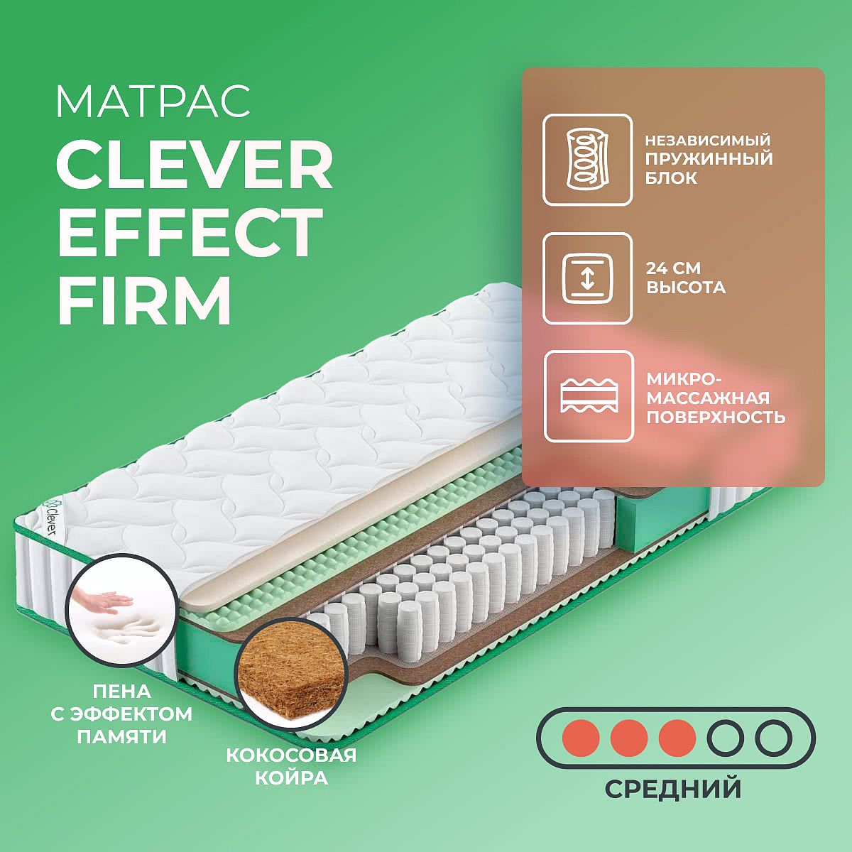 Матрас «Clever Effect Firm» — средней жесткости, которая комфортна большинству людей среднего телосложения. Это — оптимальный вариант и детям, и взрослым, и пожилым людям.