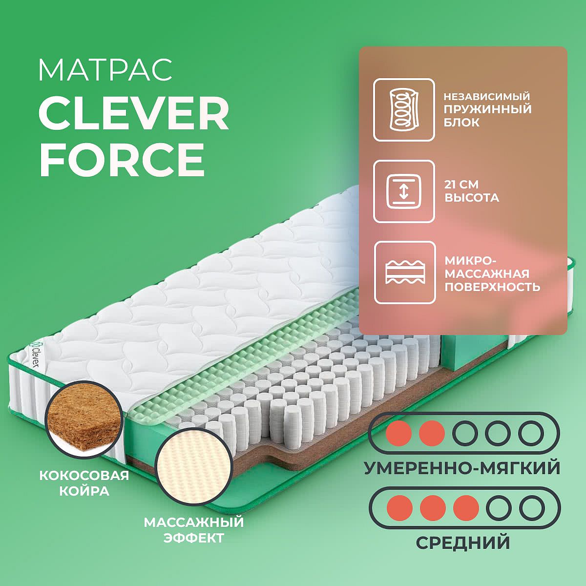 Нагрузка на спальное место, кг: 110. Высота, см: 21. Базовая основа матраса Force от бренда Clever — независимый пружинный блок TFK, который содержит 500 пружин на каждое спальное место. Блок создан так, что пружины между собой не пересекаются при нагрузке, будет сжата та пружина, на которой в данный момент лежит спящий. Таким образом, отсутствует “эффект проваливания” в матрас. Матрас двусторонний. С одной стороны умеренно-мягкий и с микромассажным эффектом — в роли наполнителя выступает пенополиуретан с рельефной нарезкой. Отдых на такой поверхности снимает стресс и расслабляет организм после трудного дня. Умеренно жесткая сторона выполнена с использованием натуральных материалов: кокосового волокна и натурального латекса. Кокосовая койра дает жесткость и правильную поддержку позвоночника, а латекс способен анатомически повторить все контуры спящего.