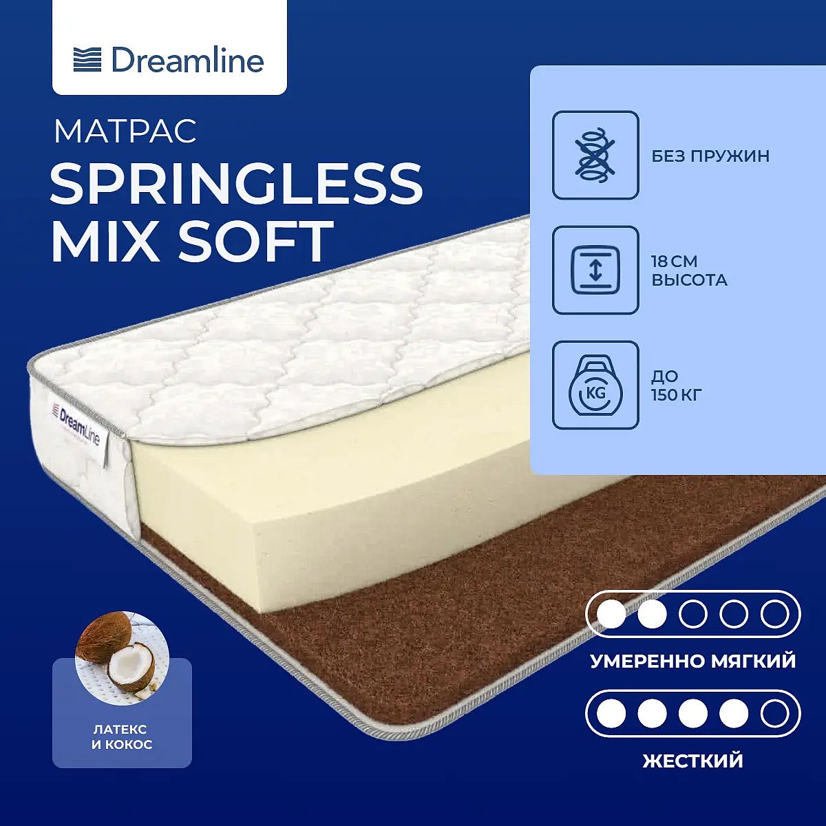 Мягкая латексная сторонаМодель имеет разную жесткость сторон. Более мягкая сторона выполнена на основе натурального латекса – упругого и невероятно мягкого материала. Он способен подстраиваться под контуры тела, максимально расслабляя его. Благодаря наличию пор на поверхности весь материал способен пропускать воздух.Жесткая кокосовая сторонаВторая, более жесткая сторона представлена слоем кокосовой койры. Этот наполнитель обладает большим эксплуатационный сроком, не крошится и не ломается со временем. Кроме того, благодаря особому расположению волокон, он отлично пропускает воздух.Чехол из жаккардаЧехол модели пошит из хлопкового жаккарда.Защита матрасаПроизводитель рекомендует использовать защитный или водонепроницаемый наматрасник для защиты матраса от нежелательных пятен и влаги, а также для увеличения срока годности всего изделия.Другие моделиМодель представлена комбинированной жесткостью: умеренно-мягкой и умеренно-жесткой. Если вы хотите такую модель, но помягче, тогда обратите внимание на модель Dreamline Soft.