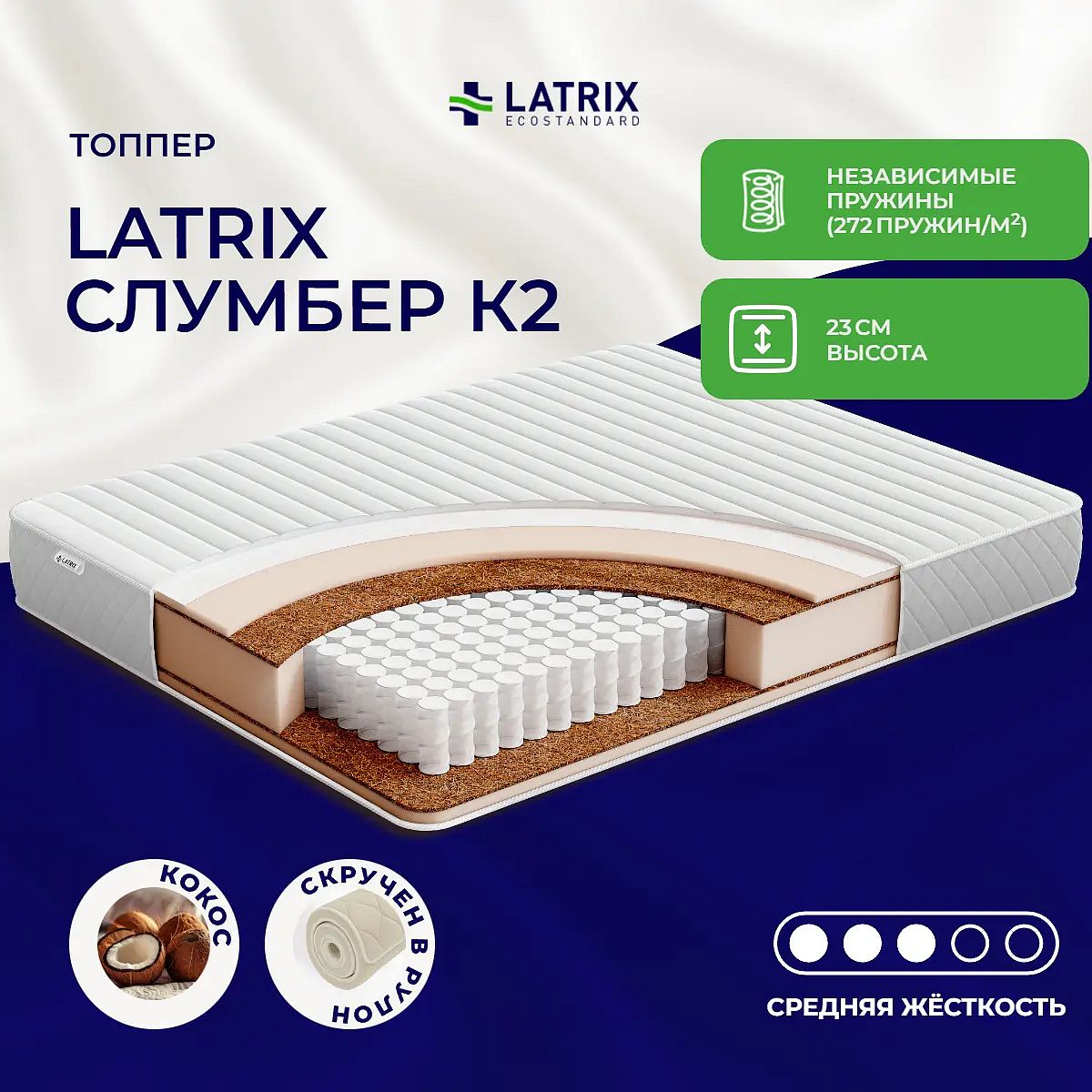 Матрас «Latrix Слумбер К2» — средней жесткости, которая комфортна большинству людей среднего телосложения. Это — универсальный вариант и детям, и взрослым, и пожилым людям.
