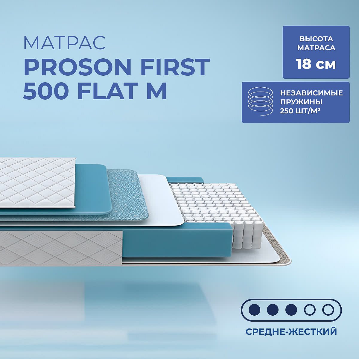 Матрас ProSon First 500 Flat M — это односторонний пружинный матрас средней жесткости для комфортного сна. Высота матраса составляет 18 см, что обеспечивает удобную посадку на кровати и поддерживает правильное положение тела во время отдыха. Модель разработана для ежедневного использования и подходит для большинства пользователей с максимальной нагрузкой до 100 кг на спальное место. В основе матраса — блок независимых пружин EVS500 PRO (500 пружин на спальное место, 250 пружин на м2), который обеспечивает точечную поддержку и снижает передачу движения. Слой пены Ортофом толщиной 1 см и ре-ортофом (ВППУ) 2 см равномерно распределяют нагрузку и способствуют мягкому, но упругому ощущению. Спанбонд и карпет добавляют износостойкости и долговечности конструкции. Ключевые особенности