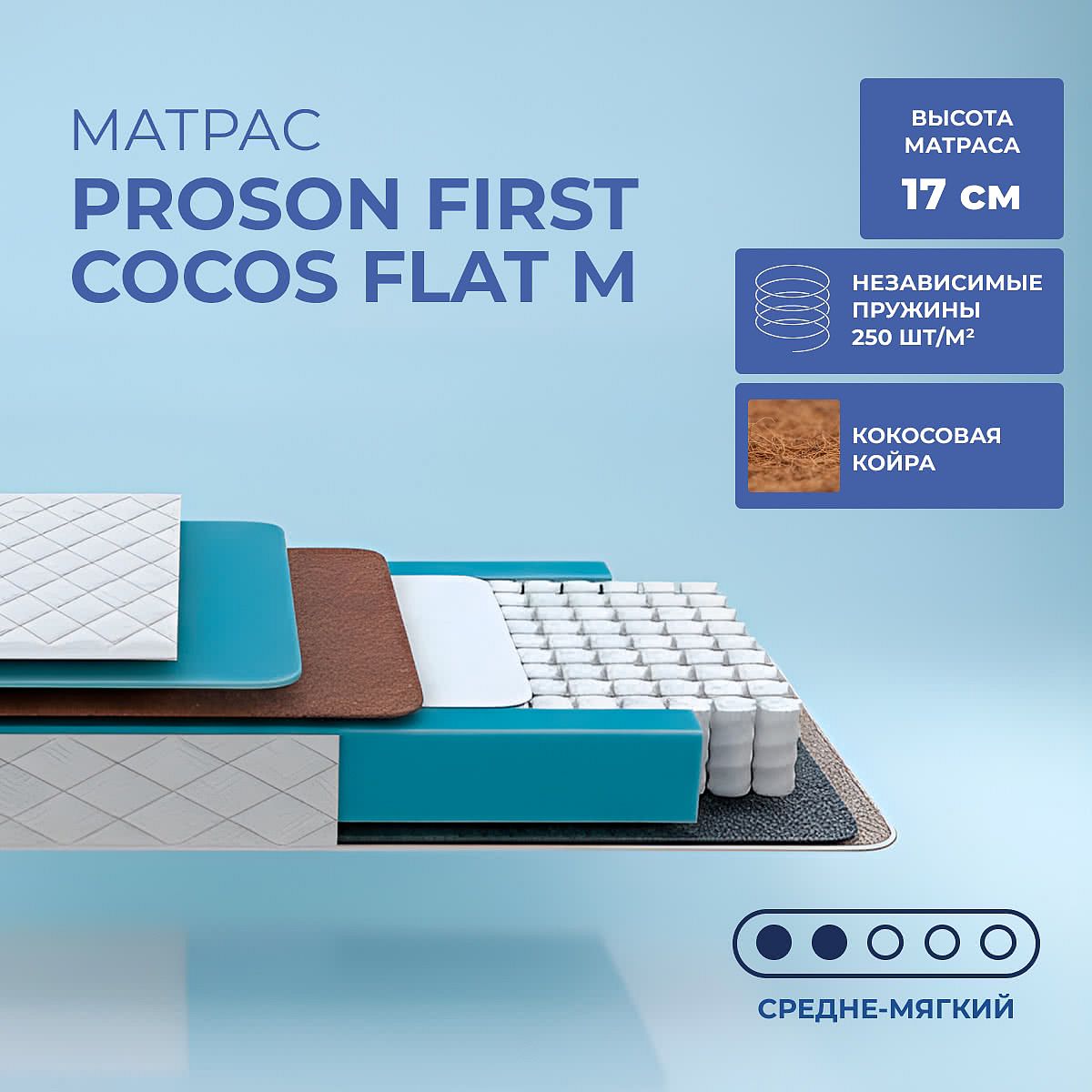 Матрас ProSon First Cocos Flat M — это односторонний пружинный матрас с умеренно мягкой поддержкой, созданный для тех, кто ценит комфорт и качественный сон. Высота 17 см делает его удобным для ежедневного использования на стандартных кроватях. Модель обеспечивает мягкое, но стабильное положение тела благодаря сочетанию независимых пружин и натурального кокоса в наполнении. Основной слой — независимый пружинный блок EVS500 PRO (500 пружин на спальное место, 250 шт/м2), который равномерно распределяет нагрузку, снижает передачу движения и подходит для людей весом до 100 кг. Тонкий слой кокоса (0,5 см) добавляет упругость, а слой ППУ (1 см) отвечает за мягкость. Жаккардовый чехол простёган на объёмном волокне (100 г/м2), что придаёт поверхности аккуратный внешний вид и дополнительный комфорт. Ключевые особенности