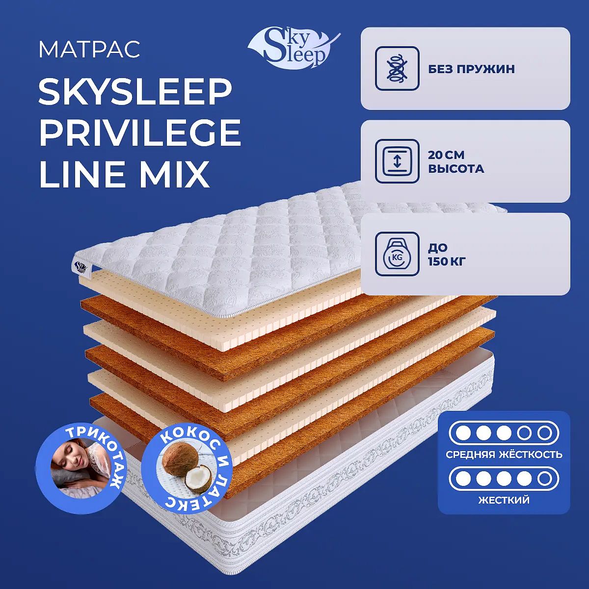 О материалахНатуральный латекс обеспечивает эластичность, мягкость и отличную вентиляцию, подстраивается под контуры тела и равномерно распределяет нагрузку. Кокосовая койра придаёт матрасу выраженную упругость и долговечность, хорошо дышит и поддерживает микроклимат спального места. Советы по уходуДля продления срока службы матраса рекомендуется использовать защитный наматрасник (не входит в комплект). О производителеSkySleep — российский бренд, создающий современные матрасы с акцентом на комфорт, качество материалов и продуманную конструкцию.