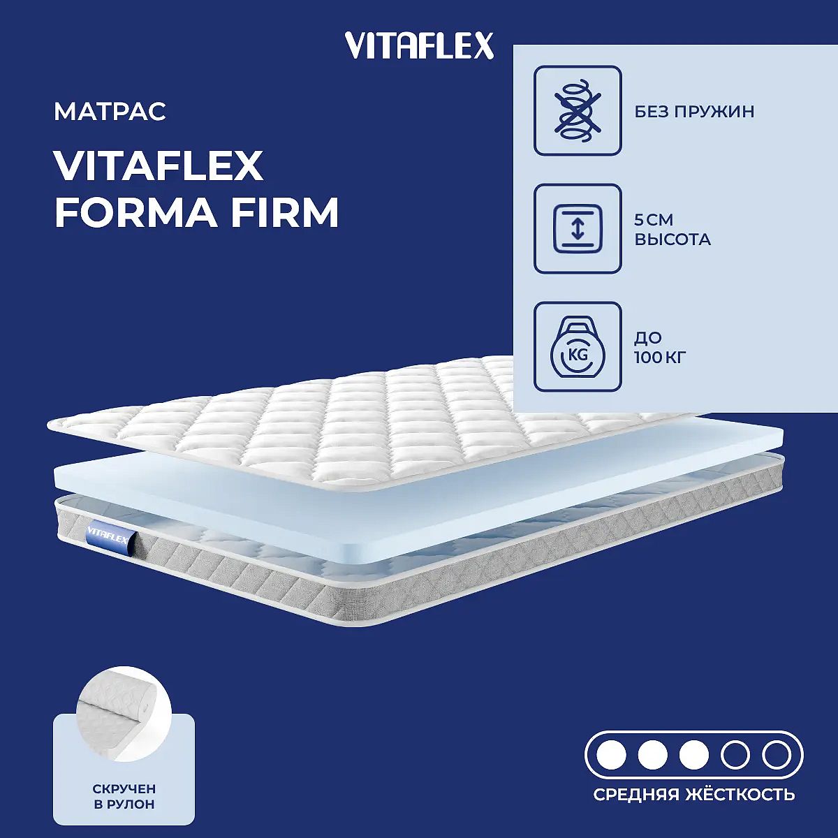 Сценарии использованияVitaflex Forma Firm подойдёт для тех, кто ищет мягкий матрас для корректировки спального места, обновления дивана или защиты основного матраса. Благодаря средней жёсткости изделие подходит для большинства пользователей со средним телосложением. УходДля продления срока службы рекомендуется использовать защитный наматрасник. Чехол несъёмный — допустима только сухая чистка. О производителеVitaflex — отечественный бренд, специализирующийся на производстве современных матрасов и аксессуаров для сна.